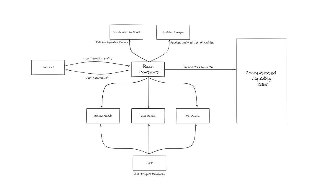 The underlying protocol has a main base vault and module contracts that manage the user’s liquidity according to the intents selected by the user.
