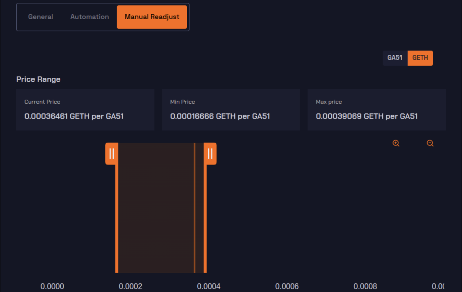 You can manually readjust the price range of your liquidity position either on the liquidity graph or edit the numbers below.