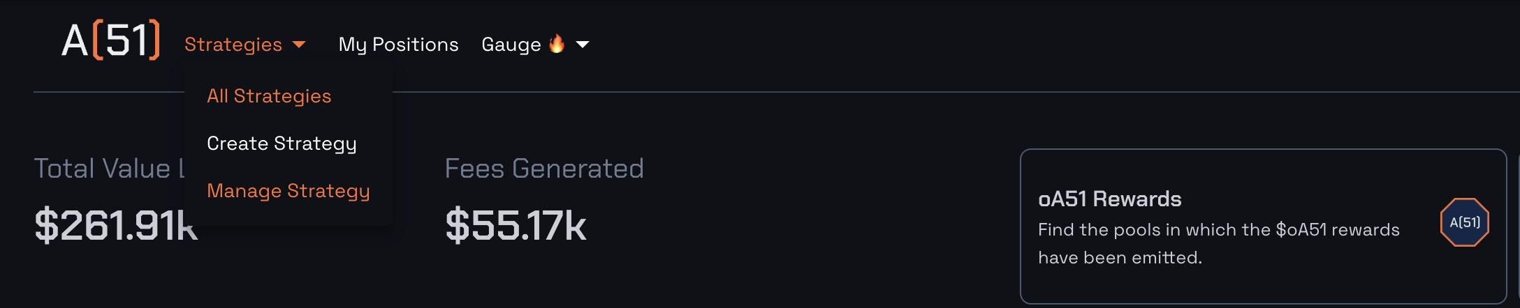 Navigate to the strategy creation page by clicking on Strategies dropdown on the top navigation bar and selecting Manage Strategy.